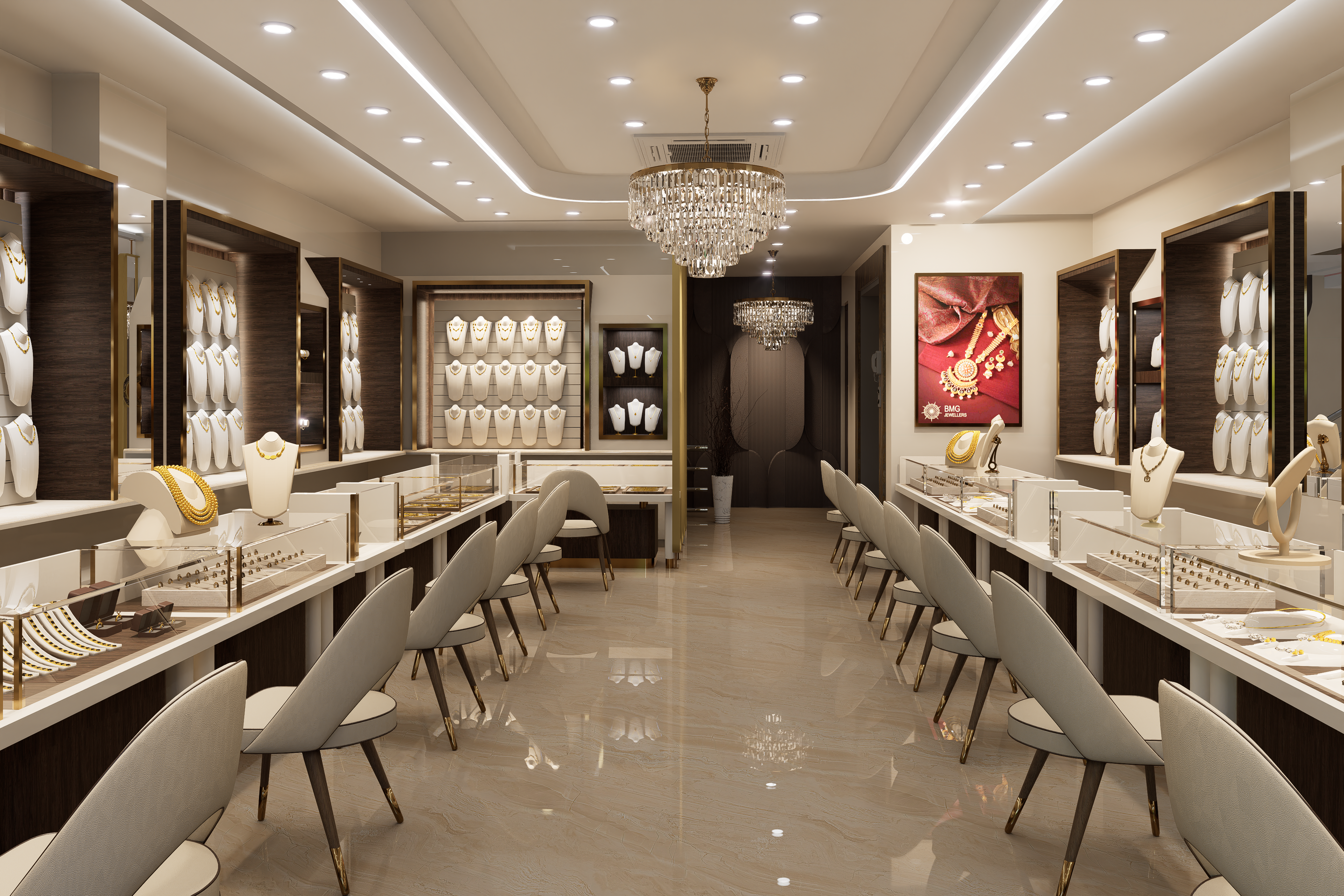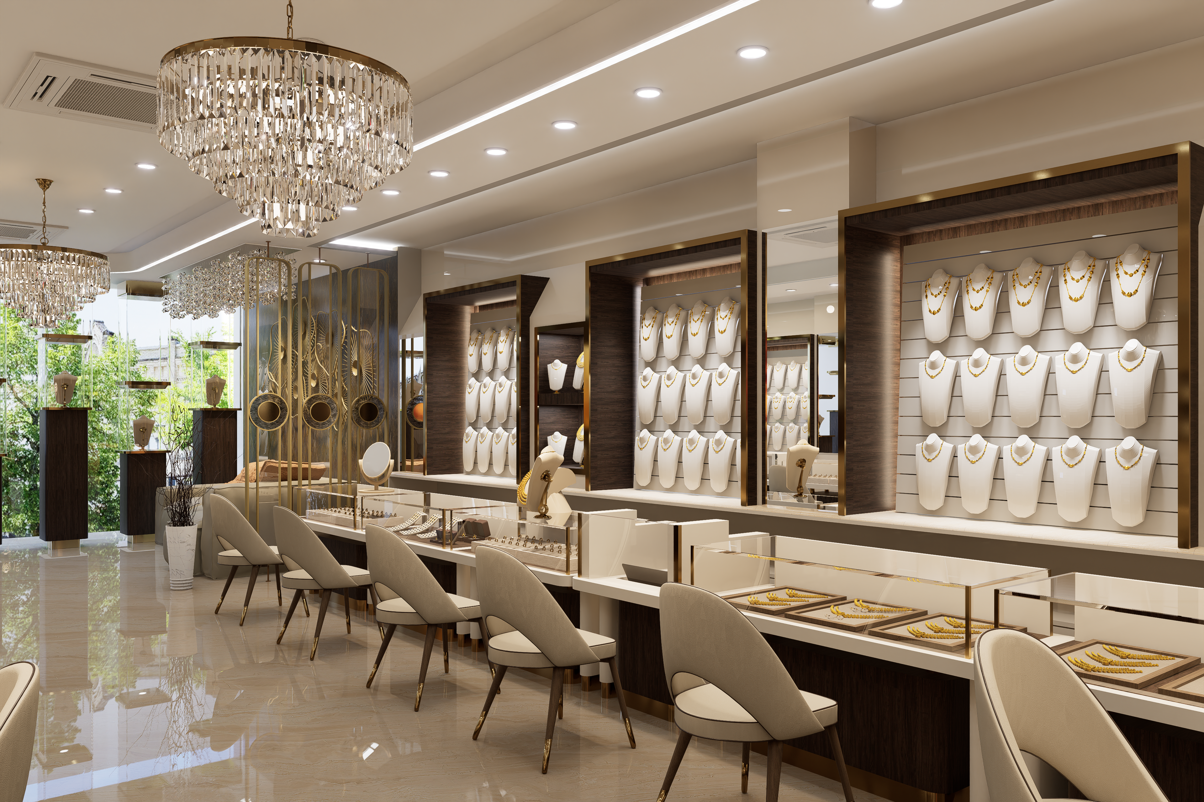 A Refined Jewellery Showroom Concept Where Spatial Symmetry Soft Lighting And Material Richness Fram: 1156 Sq.Ft Showroom Area